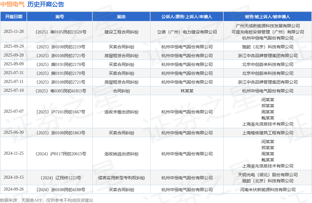 案号:(2025)浙0108民初2219号根据统计,近一年内以杭州中恒电气股份有限公司为当事人的历史开庭公告有12则,其中案由为“买卖合同纠纷”的公告以5则居首,其次为“房屋租赁合同纠纷”有2则,“侵害实用新型专利权纠纷”有1则。历史开庭公告如下:
