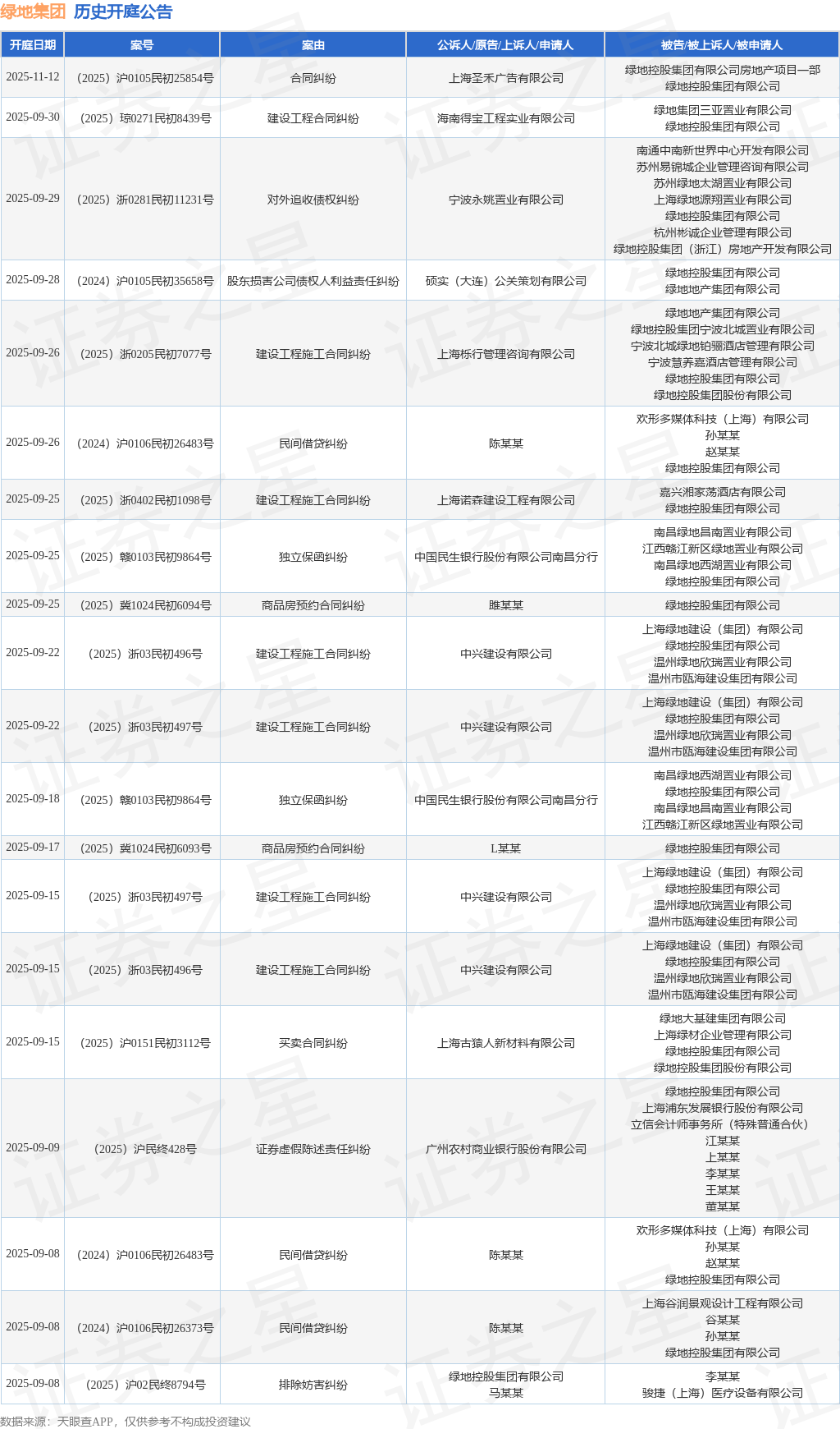 案号:(2025)浙0281民初11231号根据统计,近一年内以绿地控股集团有限公司为当事人的历史开庭公告有205则,其中案由为“建设工程施工合同纠纷”的公告以33则居首,其次为“金融借款合同纠纷”有25则,“合同纠纷”有19则。历史开庭公告(前20条)如下:
