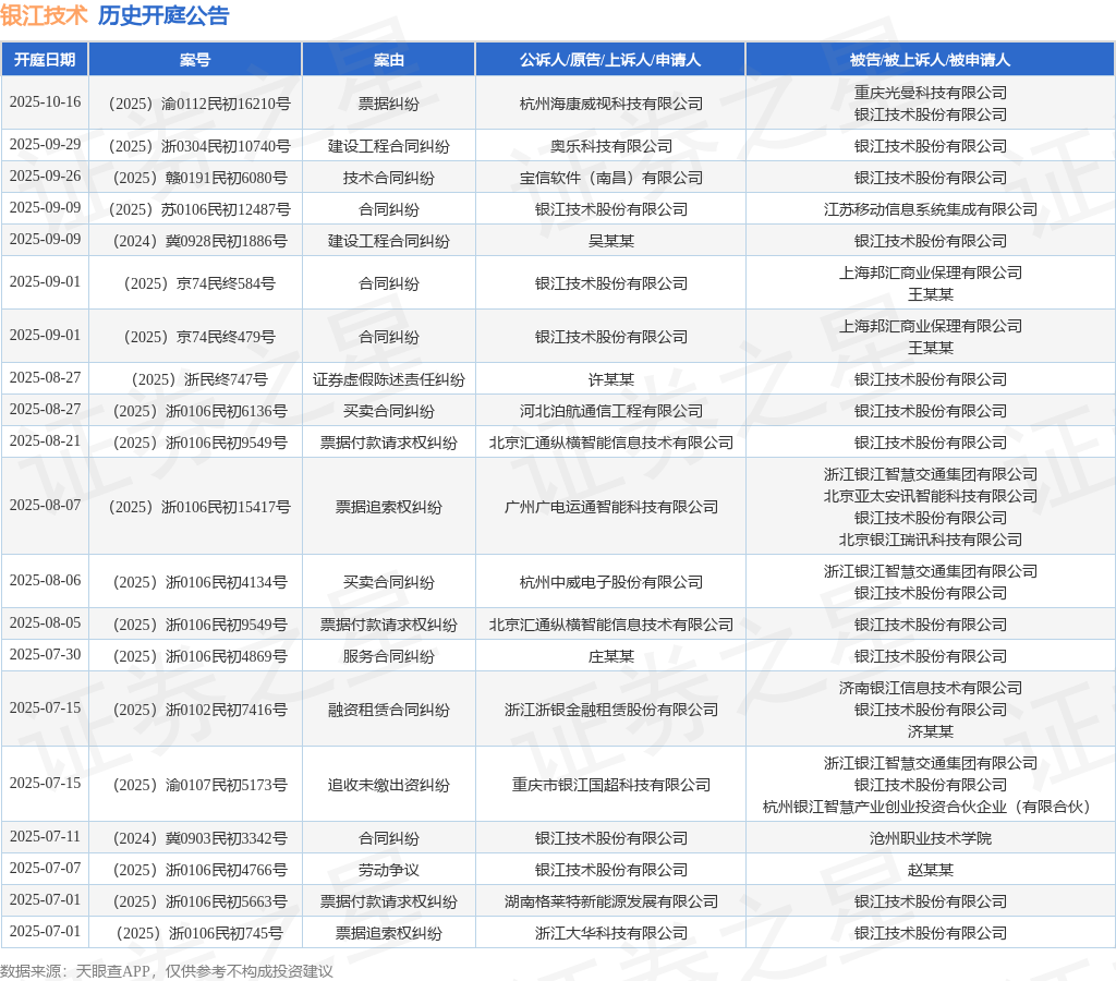 案号:(2025)浙0304民初10740号根据统计,近一年内以银江技术股份有限公司为当事人的历史开庭公告有98则,其中案由为“劳动争议”的公告以13则居首,其次为“票据追索权纠纷”有12则,“合同纠纷”有12则。历史开庭公告(前20条)如下: