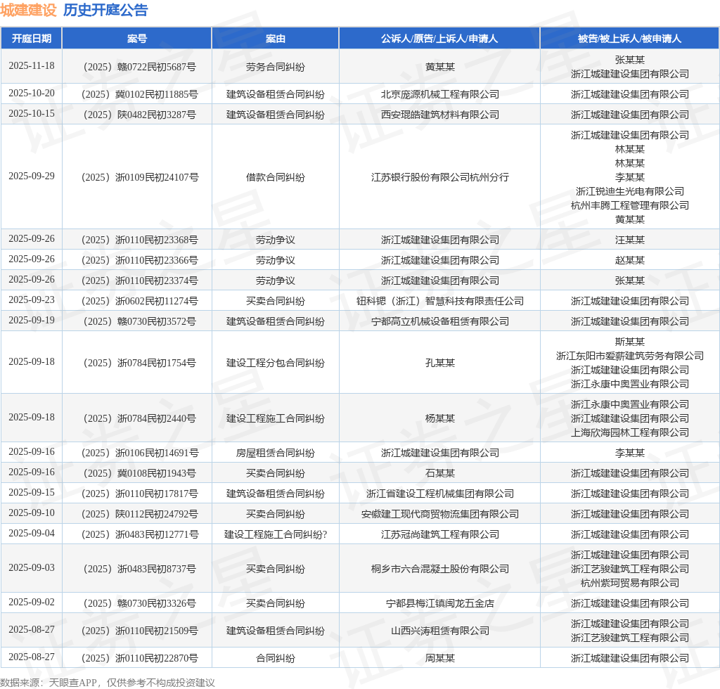 案号:(2025)浙0109民初24107号根据统计,近一年内以浙江城建建设集团有限公司为当事人的历史开庭公告有292则,其中案由为“买卖合同纠纷”的公告以87则居首,其次为“建设工程施工合同纠纷”有42则,“建筑设备租赁合同纠纷”有30则。历史开庭公告(前20条)如下: