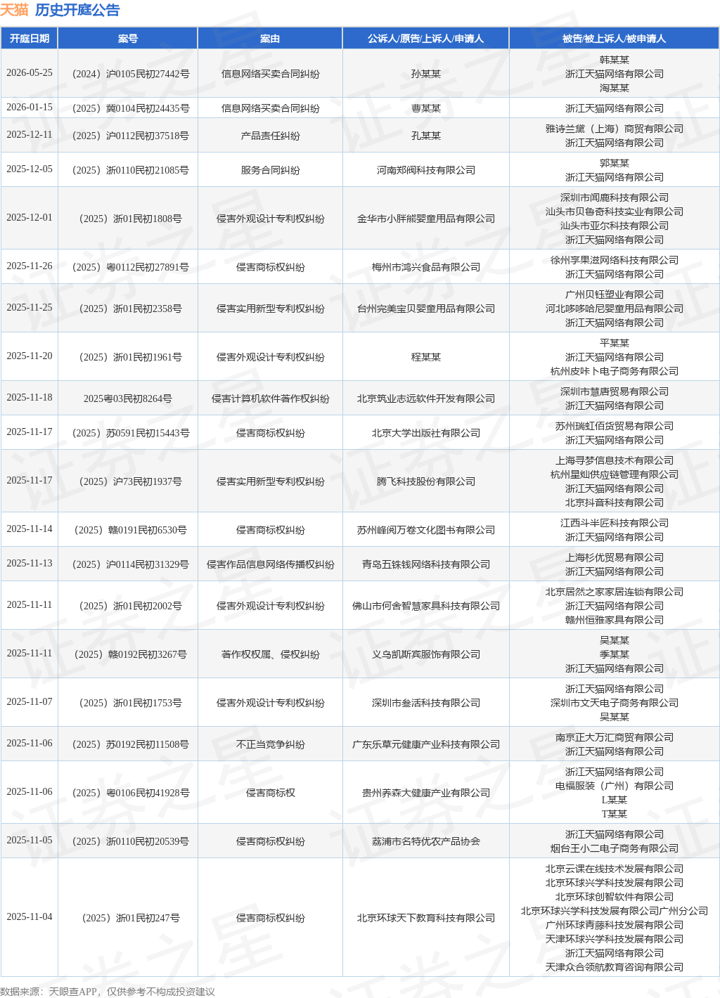 案号:(2024)浙01民初2361号根据统计,近一年内以浙江天猫网络有限公司为当事人的历史开庭公告有2414则,其中案由为“著作权权属、侵权纠纷”的公告以598则居首,其次为“侵害商标权纠纷”有408则,“侵害外观设计专利权纠纷”有379则。历史开庭公告(前20条)如下: