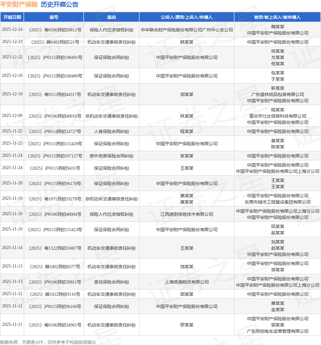 案号:(2025)粤0307民初34727号根据统计,近一年内以中国平安财产保险股份有限公司为当事人的历史开庭公告有2569则,其中案由为“机动车交通事故责任纠纷”的公告以1222则居首,其次为“保证保险合同纠纷”有322则,“保险人代位求偿权纠纷”有181则。历史开庭公告(前20条)如下:
