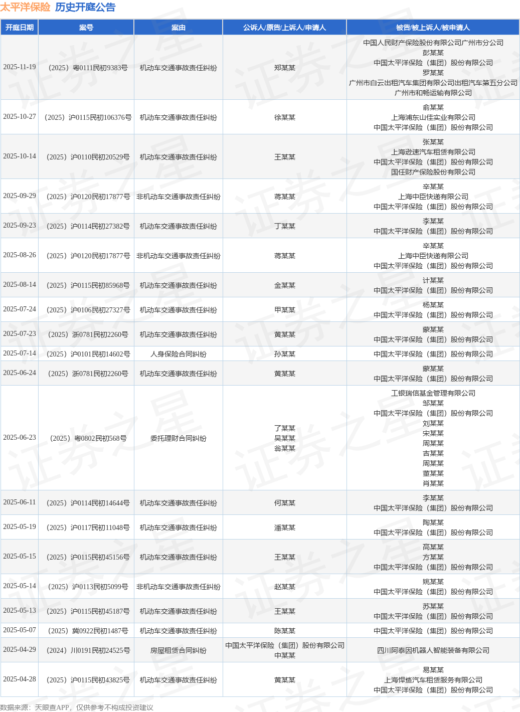 案号:(2025)沪0120民初17877号根据统计,近一年内以中国太平洋保险(集团)股份有限公司为当事人的历史开庭公告有51则,其中案由为“机动车交通事故责任纠纷”的公告以35则居首,其次为“非机动车交通事故责任纠纷”有5则,“侵害作品信息网络传播权纠纷”有3则。历史开庭公告(前20条)如下:
