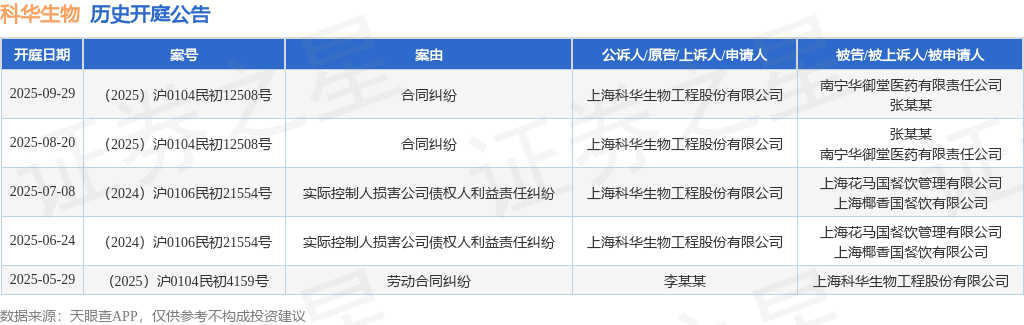 案号:(2025)沪0104民初12508号根据统计,近一年内以上海科华生物工程股份有限公司为当事人的历史开庭公告有5则,其中案由为“合同纠纷”的公告以2则居首,其次为“实际控制人损害公司债权人利益责任纠纷”有2则,“劳动合同纠纷”有1则。历史开庭公告如下: