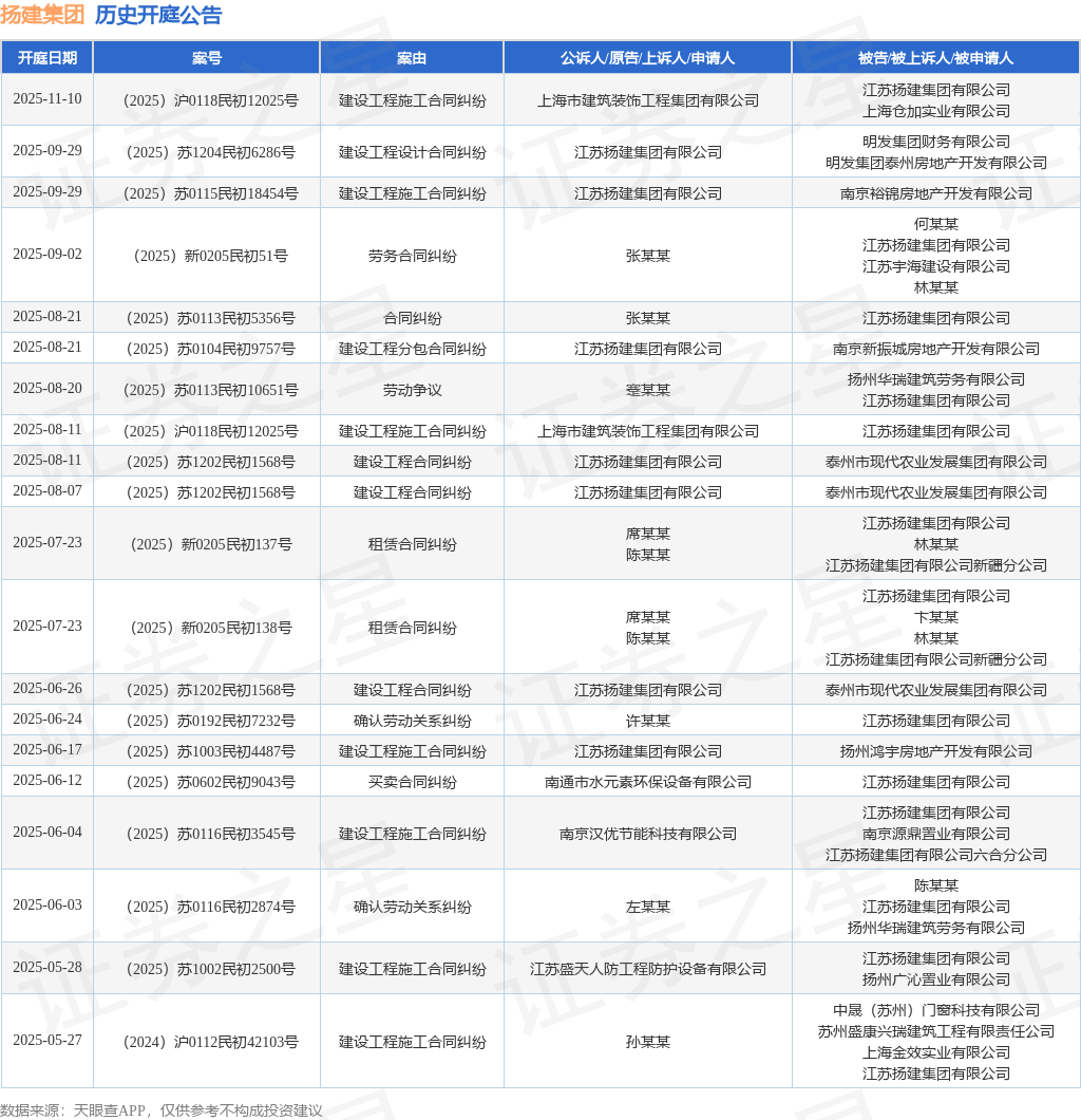 案号:(2025)苏1204民初6286号根据统计,近一年内以江苏扬建集团有限公司为当事人的历史开庭公告有113则,其中案由为“建设工程施工合同纠纷”的公告以26则居首,其次为“建设工程合同纠纷”有15则,“买卖合同纠纷”有13则。历史开庭公告(前20条)如下: