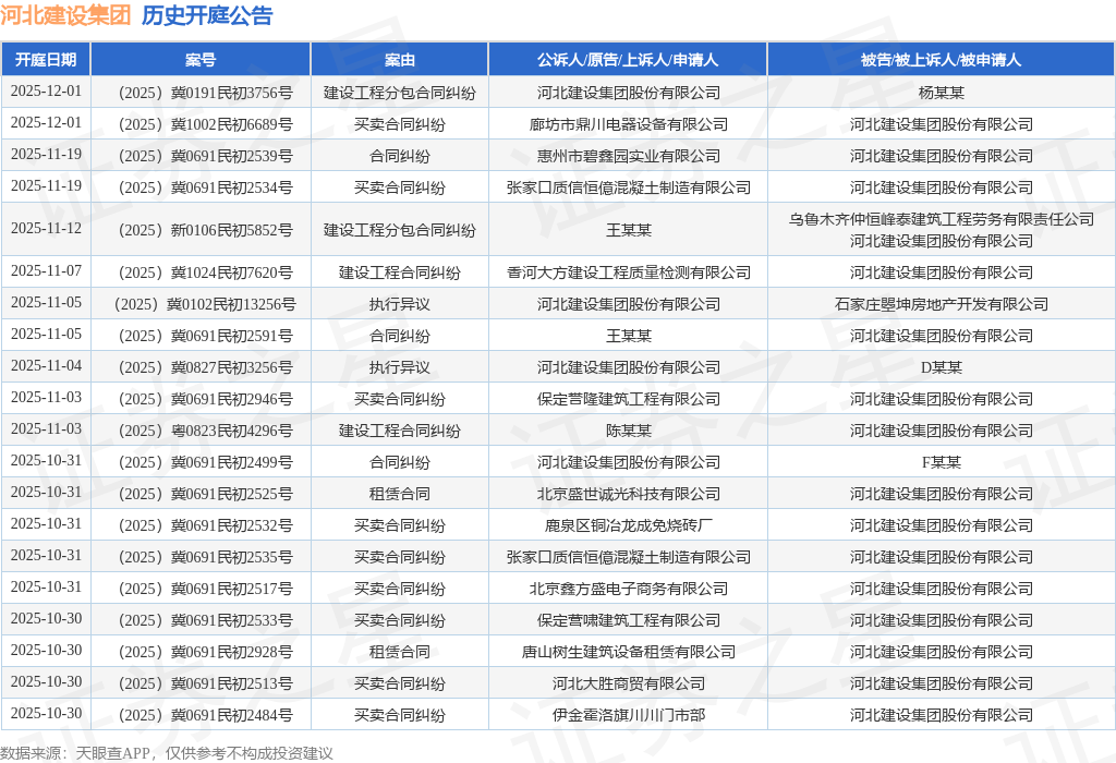 案号:(2025)冀0826民初4482号根据统计,近一年内以河北建设集团股份有限公司为当事人的历史开庭公告有1612则,其中案由为“买卖合同纠纷”的公告以649则居首,其次为“建设工程施工合同纠纷”有225则,“劳务合同纠纷”有124则。历史开庭公告(前20条)如下: