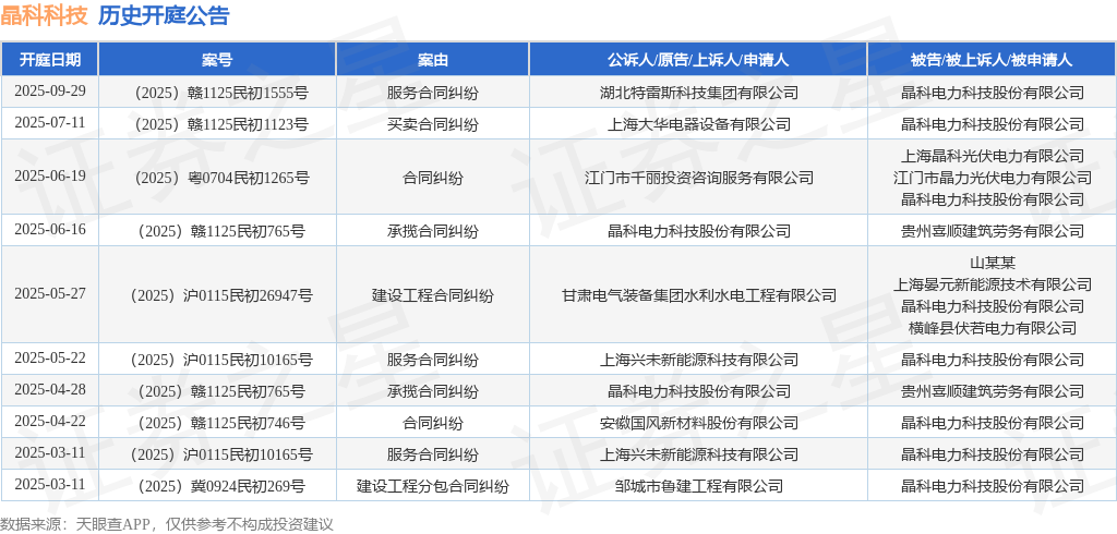 案号:(2025)赣1125民初1555号根据统计,近一年内以晶科电力科技股份有限公司为当事人的历史开庭公告有10则,其中案由为“服务合同纠纷”的公告以3则居首,其次为“合同纠纷”有2则,“承揽合同纠纷”有2则。历史开庭公告如下: