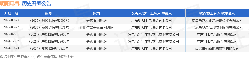 根据统计,近一年内以广东明阳电气股份有限公司为当事人的历史开庭公告有5则,其中案由为“买卖合同纠纷”的公告以4则居首,其次为“分期付款买卖合同纠纷”有1则。历史开庭公告如下: