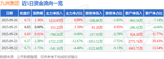 证券之星消息,截至2025年9月26日收盘,九洲集团(300040)报收于6.72元,上涨1.36%,换手率4.11%,成交量19.99万手,成交额1.35亿元。