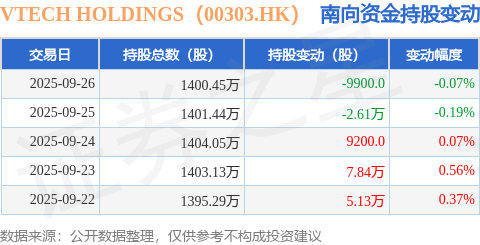 证券之星消息,9月26日南向资金减持9900.0股VTECH HOLDINGS(00303.HK)。近5个交易日中,获南向资金增持的有3天,累计净增持10.29万股。近20个交易日中,获南向资金减持的有11天,累计净减持19.3万股。截至目前,南向资金持有VTECH HOLDINGS(00303.HK)1400.45万股,占公司已发行普通股的5.53%。