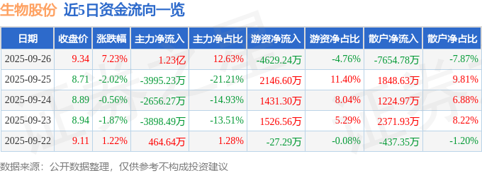证券之星消息,截至2025年9月26日收盘,生物股份(600201)报收于9.34元,上涨7.23%,换手率9.33%,成交量103.67万手,成交额9.73亿元。