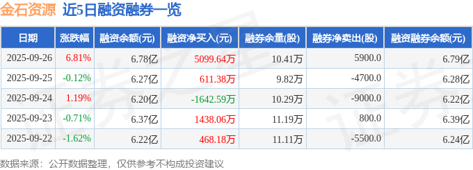 证券之星消息,截至2025年9月26日收盘,金石资源(603505)报收于18.19元,上涨6.81%,换手率5.28%,成交量44.44万手,成交额7.99亿元。