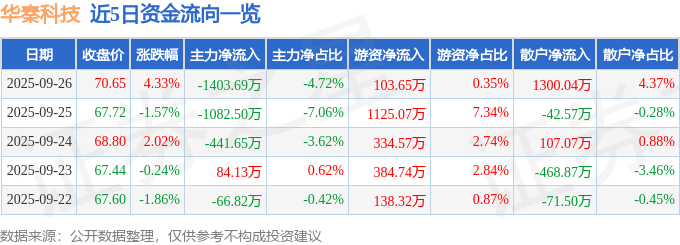 证券之星消息,截至2025年9月26日收盘,华秦科技(688281)报收于70.65元,上涨4.33%,换手率1.54%,成交量4.21万手,成交额2.97亿元。