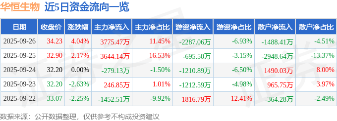 证券之星消息,截至2025年9月26日收盘,华恒生物(688639)报收于34.23元,上涨4.04%,换手率3.86%,成交量9.66万手,成交额3.3亿元。
