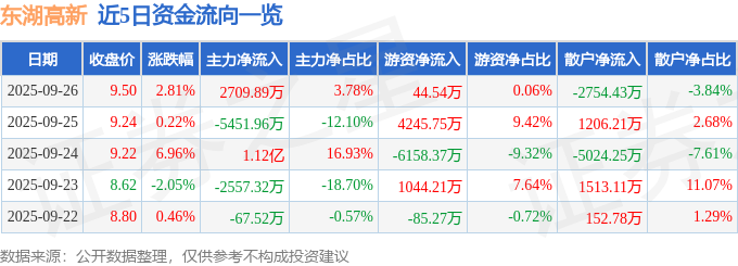 证券之星消息,截至2025年9月26日收盘,东湖高新(600133)报收于9.5元,上涨2.81%,换手率7.0%,成交量74.63万手,成交额7.17亿元。