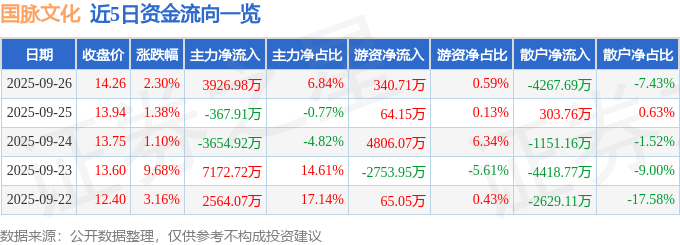证券之星消息,截至2025年9月26日收盘,国脉文化(600640)报收于14.26元,上涨2.3%,换手率5.04%,成交量40.08万手,成交额5.74亿元。