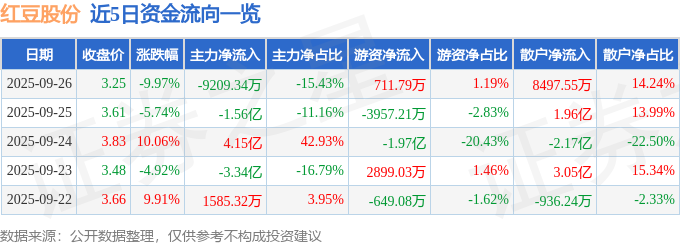 证券之星消息,截至2025年9月26日收盘,红豆股份(600400)报收于3.25元,下跌9.97%,跌停,换手率7.94%,成交量181.86万手,成交额5.97亿元。