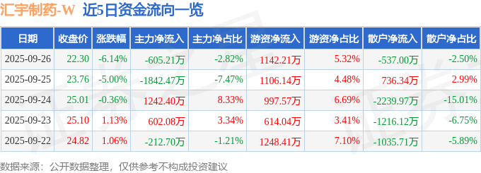 证券之星消息,截至2025年9月26日收盘,汇宇制药(688553)报收于22.3元,下跌6.14%,换手率2.77%,成交量9.52万手,成交额2.15亿元。