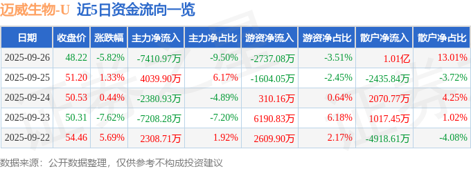 证券之星消息,截至2025年9月26日收盘,迈威生物(688062)报收于48.22元,下跌5.82%,换手率7.86%,成交量16.05万手,成交额7.8亿元。