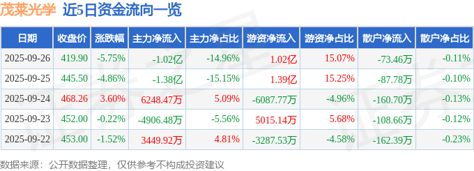 证券之星消息,截至2025年9月26日收盘,茂莱光学(688502)报收于419.9元,下跌5.75%,换手率9.4%,成交量1.58万手,成交额6.79亿元。
