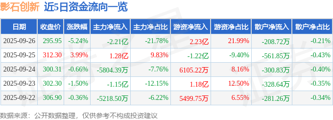 证券之星消息,截至2025年9月26日收盘,影石创新(688775)报收于295.95元,下跌5.24%,换手率11.07%,成交量3.38万手,成交额10.13亿元。
