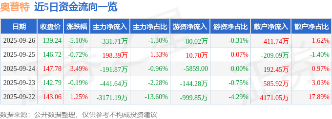 证券之星消息,截至2025年9月26日收盘,奥普特(688686)报收于139.24元,下跌5.1%,换手率1.45%,成交量1.78万手,成交额2.54亿元。
