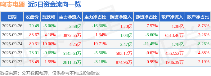 证券之星消息,截至2025年9月26日收盘,鸣志电器(603728)报收于79.49元,下跌5.0%,换手率4.66%,成交量19.52万手,成交额15.83亿元。