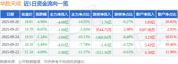 证券之星消息,截至2025年9月26日收盘,华胜天成(600410)报收于18.81元,下跌4.9%,换手率13.34%,成交量146.27万手,成交额28.01亿元。