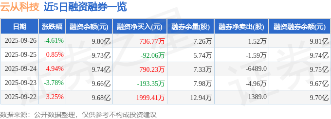 云从科技融资融券信息显示,融资方面,当日融资买入8543.35万元,融资偿还7806.58万元,融资净买入736.77万元。融券方面,融券卖出1.91万股,融券偿还3854.0股,融券余量7.26万股,融券余额123.05万元。融资融券余额9.81亿元。
