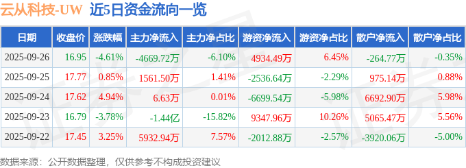 证券之星消息,截至2025年9月26日收盘,云从科技(688327)报收于16.95元,下跌4.61%,换手率5.31%,成交量44.23万手,成交额7.65亿元。