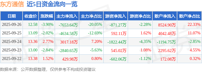 证券之星消息,截至2025年9月26日收盘,东方通信(600776)报收于12.58元,下跌3.9%,换手率3.13%,成交量29.94万手,成交额3.82亿元。