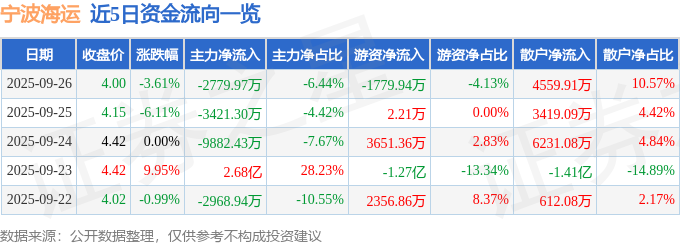 证券之星消息,截至2025年9月26日收盘,宁波海运(600798)报收于4.0元,下跌3.61%,换手率8.84%,成交量106.65万手,成交额4.31亿元。