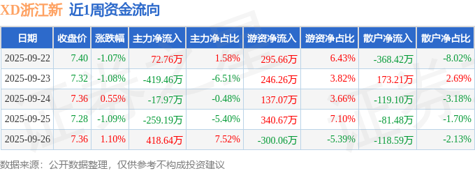 资金流向数据方面,本周浙江新能主力资金合计净流出205.23万元,游资资金合计净流入719.61万元,散户资金合计净流出514.38万元。本周资金流向一览见下表: