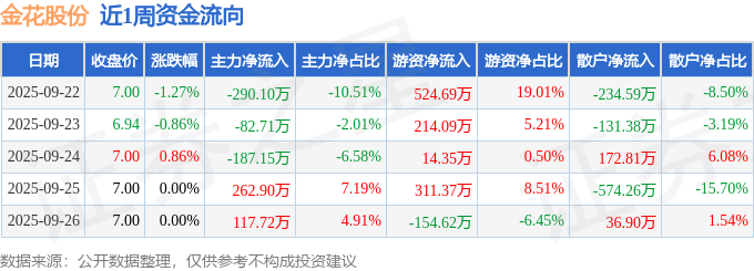 资金流向数据方面,本周金花股份主力资金合计净流出179.36万元,游资资金合计净流入909.88万元,散户资金合计净流出730.52万元。本周资金流向一览见下表: