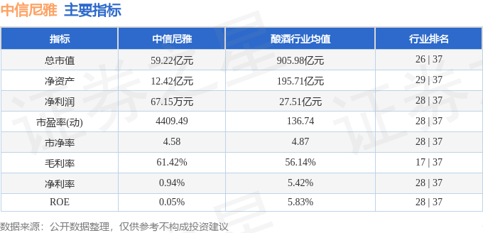 中信尼雅(600084)主营业务:葡萄种植、生产、销售。 中信尼雅2025年中报显示,公司主营收入6963.51万元,同比上升4.05%;归母净利润67.15万元,同比上升113.44%;扣非净利润-216.2万元,同比上升71.76%;其中2025年第二季度,公司单季度主营收入3387.84万元,同比上升14.66%;单季度归母净利润-118.26万元,同比上升80.61%;单季度扣非净利润-318.61万元,同比上升59.03%;负债率12.04%,投资收益275.51万元,财务费用65.32万元,毛利率61.42%。