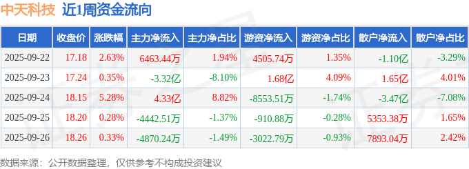 资金流向数据方面,本周中天科技主力资金合计净流入7163.64万元,游资资金合计净流入8785.0万元,散户资金合计净流出1.59亿元。本周资金流向一览见下表: