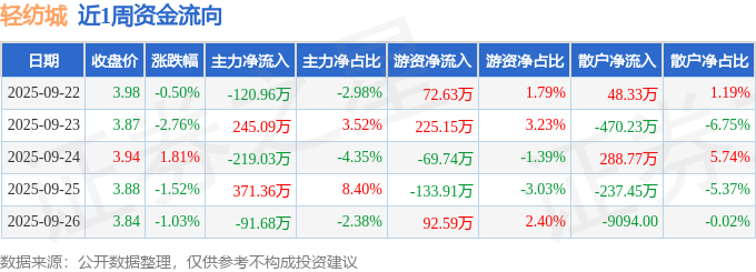 资金流向数据方面,本周轻纺城主力资金合计净流入184.78万元,游资资金合计净流入186.71万元,散户资金合计净流出371.49万元。本周资金流向一览见下表:
