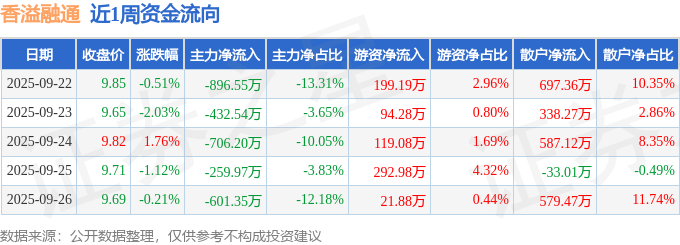 资金流向数据方面,本周香溢融通主力资金合计净流出2896.61万元,游资资金合计净流入727.41万元,散户资金合计净流入2169.2万元。本周资金流向一览见下表: