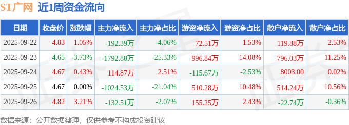 资金流向数据方面,本周ST广网主力资金合计净流出3027.44万元,游资资金合计净流入1619.22万元,散户资金合计净流入1408.22万元。本周资金流向一览见下表: