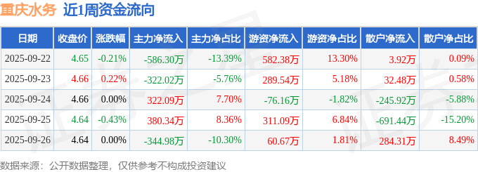 资金流向数据方面,本周重庆水务主力资金合计净流出550.86万元,游资资金合计净流入1167.51万元,散户资金合计净流出616.65万元。本周资金流向一览见下表: