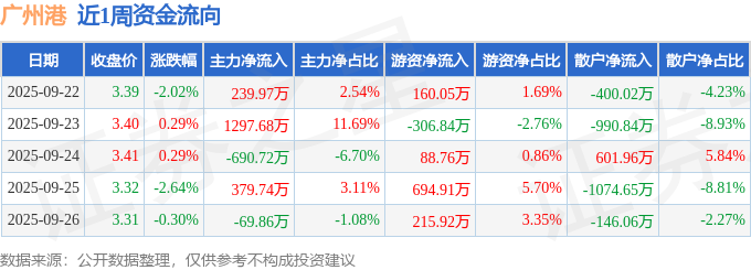 资金流向数据方面,本周广州港主力资金合计净流入1156.81万元,游资资金合计净流入852.79万元,散户资金合计净流出2009.61万元。本周资金流向一览见下表:
