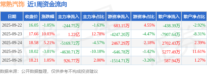 资金流向数据方面,本周常熟汽饰主力资金合计净流入3036.43万元,游资资金合计净流出3258.25万元,散户资金合计净流入221.83万元。本周资金流向一览见下表:
