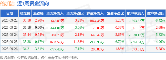 资金流向数据方面,本周倍加洁主力资金合计净流入1249.68万元,游资资金合计净流入1032.92万元,散户资金合计净流出2282.6万元。本周资金流向一览见下表: