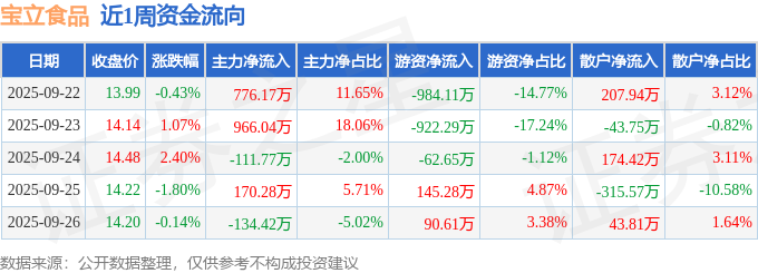 资金流向数据方面,本周宝立食品主力资金合计净流入1666.31万元,游资资金合计净流出1733.16万元,散户资金合计净流入66.85万元。本周资金流向一览见下表: