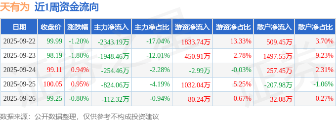 资金流向数据方面,本周天有为主力资金合计净流出5482.49万元,游资资金合计净流入3393.95万元,散户资金合计净流入2088.54万元。本周资金流向一览见下表: