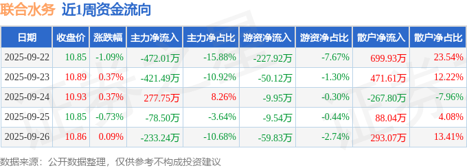 资金流向数据方面,本周联合水务主力资金合计净流出927.49万元,游资资金合计净流出357.36万元,散户资金合计净流入1284.84万元。本周资金流向一览见下表:
