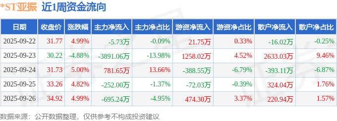 资金流向数据方面,本周*ST亚振主力资金合计净流出4062.37万元,游资资金合计净流入1293.49万元,散户资金合计净流入2768.88万元。本周资金流向一览见下表: