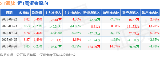 资金流向数据方面,本周ST通脉主力资金合计净流出145.55万元,游资资金合计净流入42.44万元,散户资金合计净流入103.1万元。本周资金流向一览见下表: