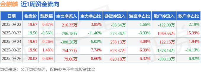 资金流向数据方面,本周金麒麟主力资金合计净流出126.35万元,游资资金合计净流入1343.97万元,散户资金合计净流出1217.62万元。本周资金流向一览见下表: