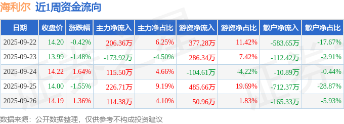资金流向数据方面,本周海利尔主力资金合计净流入489.03万元,游资资金合计净流入1095.63万元,散户资金合计净流出1584.66万元。本周资金流向一览见下表: